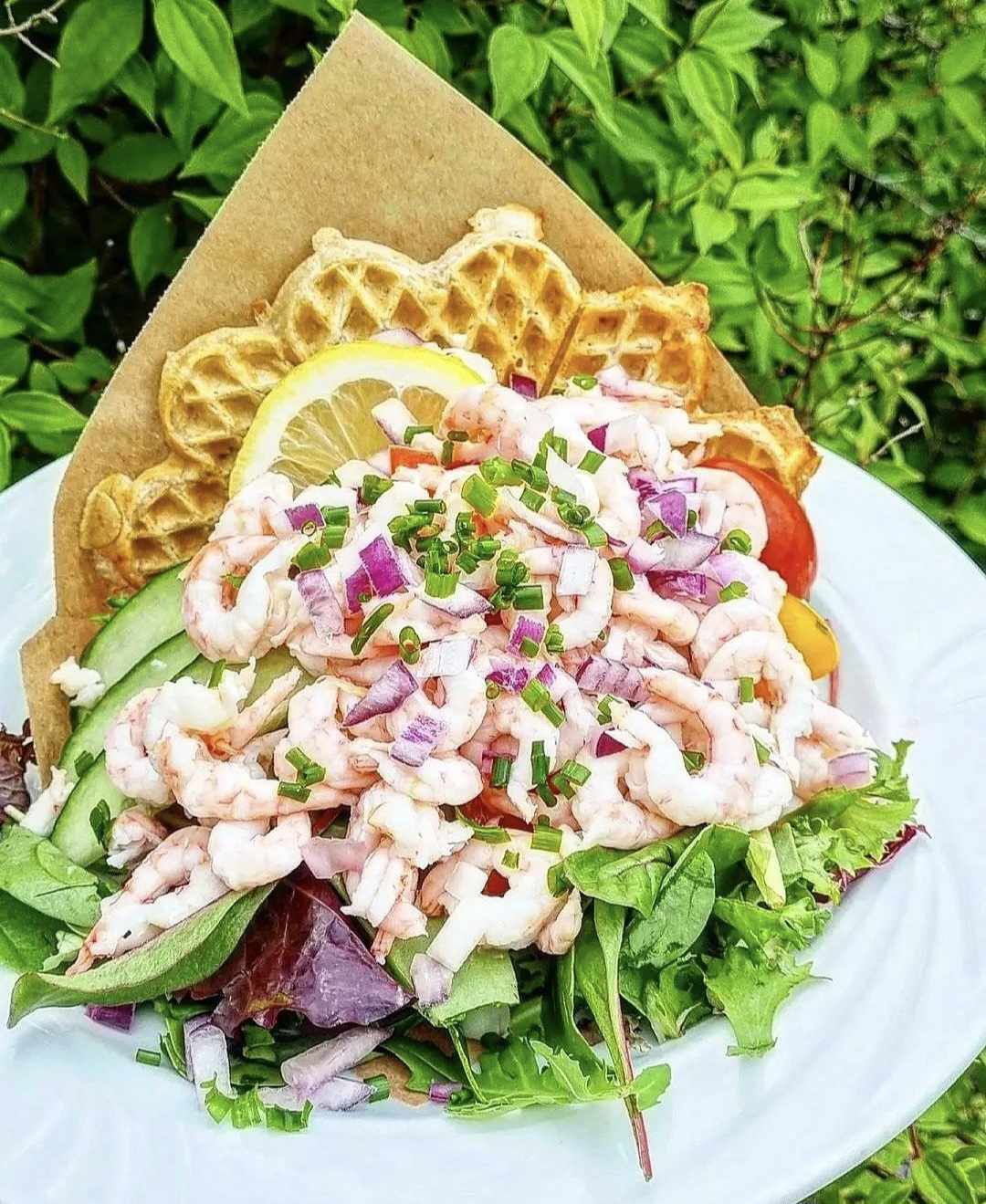 En lyxigare skagenvåffla med  270g handskalade räkor.