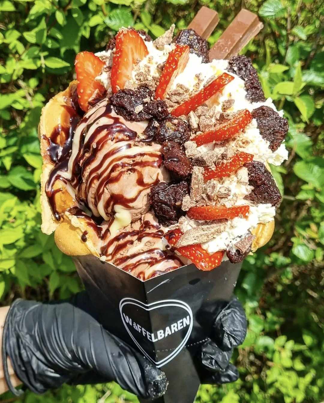 Bubbelvåffla med smultron- & blåbärsglass, grädde, marshmallows & strösselmix.
